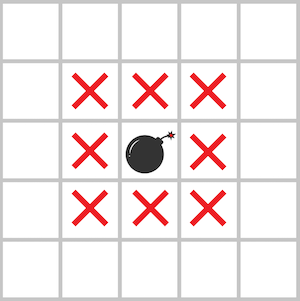 다음 그림과 같이 지뢰가 있는 지역과 지뢰에 인접한 위, 아래, 좌, 우 대각선 칸을 모두 위험지역으로 분류합니다.