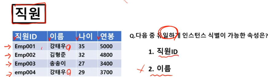 :엔터티 내 유일한 인스턴스를 식별할 수 있는 속성의 집합 ex)직원 id