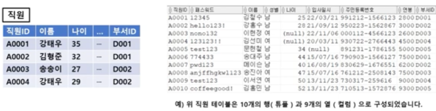 - RDBMS에서 실제 데이터가 저장되고 조회되는 2차원 배열 형태의 저장소 공간