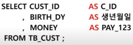 ==> AS는 SELECT 부분에서 출력하려는 컬럼에 대해 새로운 별명(ALIAS)를 부여할 수 있음.