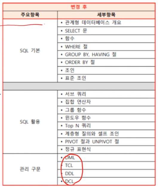 | TCL(Transaction Control Language, 트랜잭션 제어어) | COMMIT, ROLLBACK, SAVEPOINT |