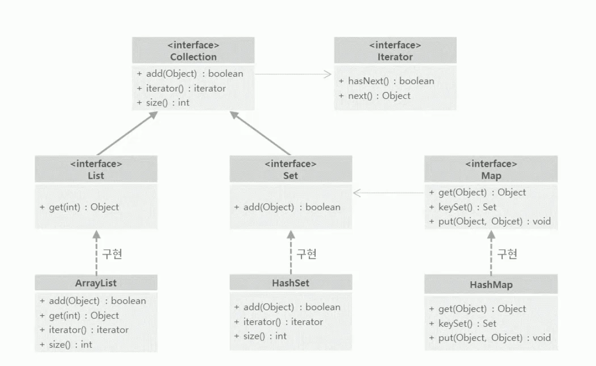 - Collection은 저장된 순서를 기억하지 못하기 때문에 "첫번째 자료를 달라, 두번째 자료를 달라"와 같은 기능을 가질 수 없다. * * Collection은 저장된 자료를 하나씩 하나씩 꺼낼 수 있는 Iterator라는 인터페이스를 반환한다.
